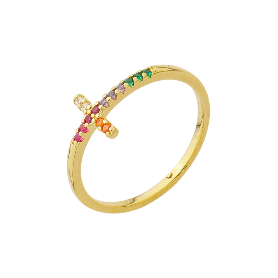 Anel cruz pedras 1mm zircônia colorida BANHO DE OURO