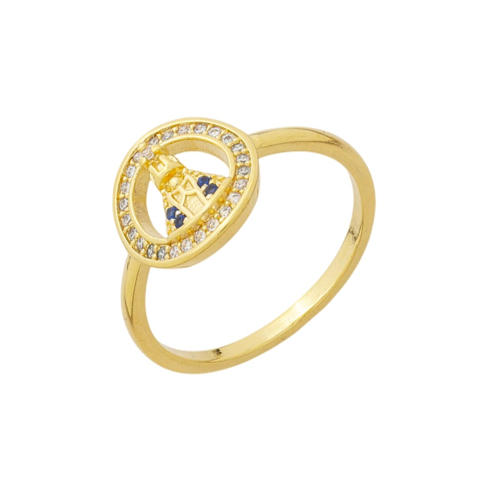 Anel trabalhado oval Nossa Senhora Aparecida com pedras 1mm zircônia azul, parte superior medindo 1,4cm BANHO DE OURO