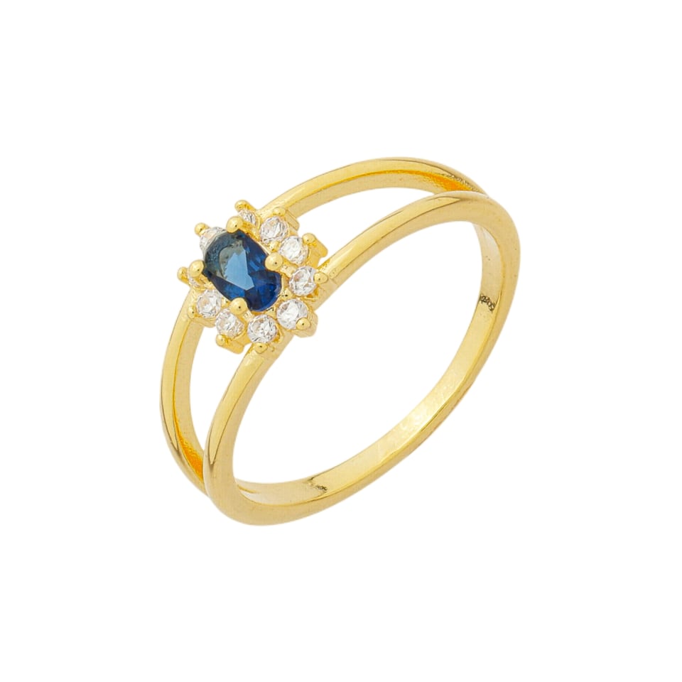 Anel pedra 5x3mm oval zircônia azul safira e em volta pedras 1,5mm zircônia BANHO DE OURO