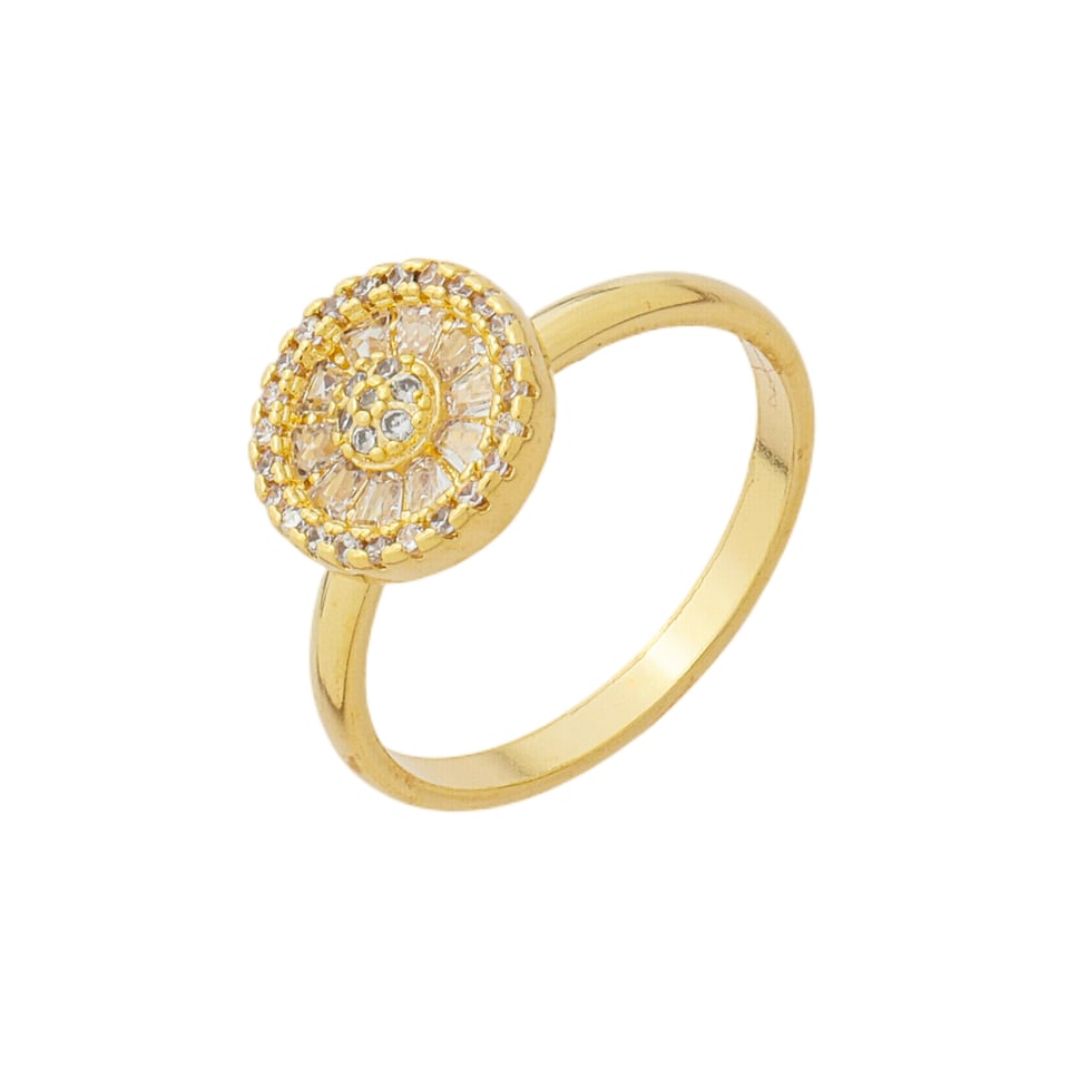 Anel pizza com pedras 2,5x2mm baguete e cravejado com pedras 1mm zircônia, medindo 1cm de diâmetro na parte superior BANHO DE OURO