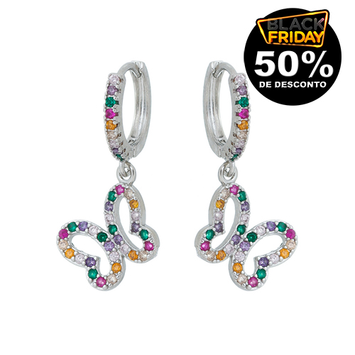 Brinco argola click com pedras 1,25mm zircônia colorida e pingente borboleta com pedras 1,25mm zircônia colorida, medindo 2,8x1,4cm BANHO DE RÓDIO