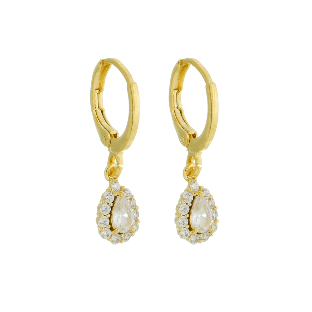 Brinco argola click com pingente pedra 5x3mm gota zircônia em volta pedra 1,50mm zircônia, medindo 2,3x0,6cm BANHO DE OURO