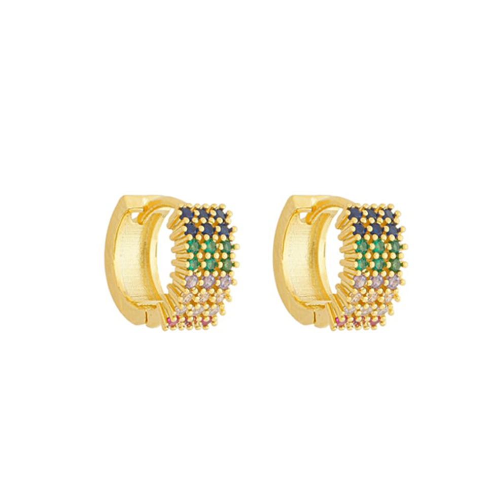 Brinco argola click com 3 fileiras pedras 1,25mm zircônia colorida, medindo 1,2cm de diâmetro BANHO DE OURO