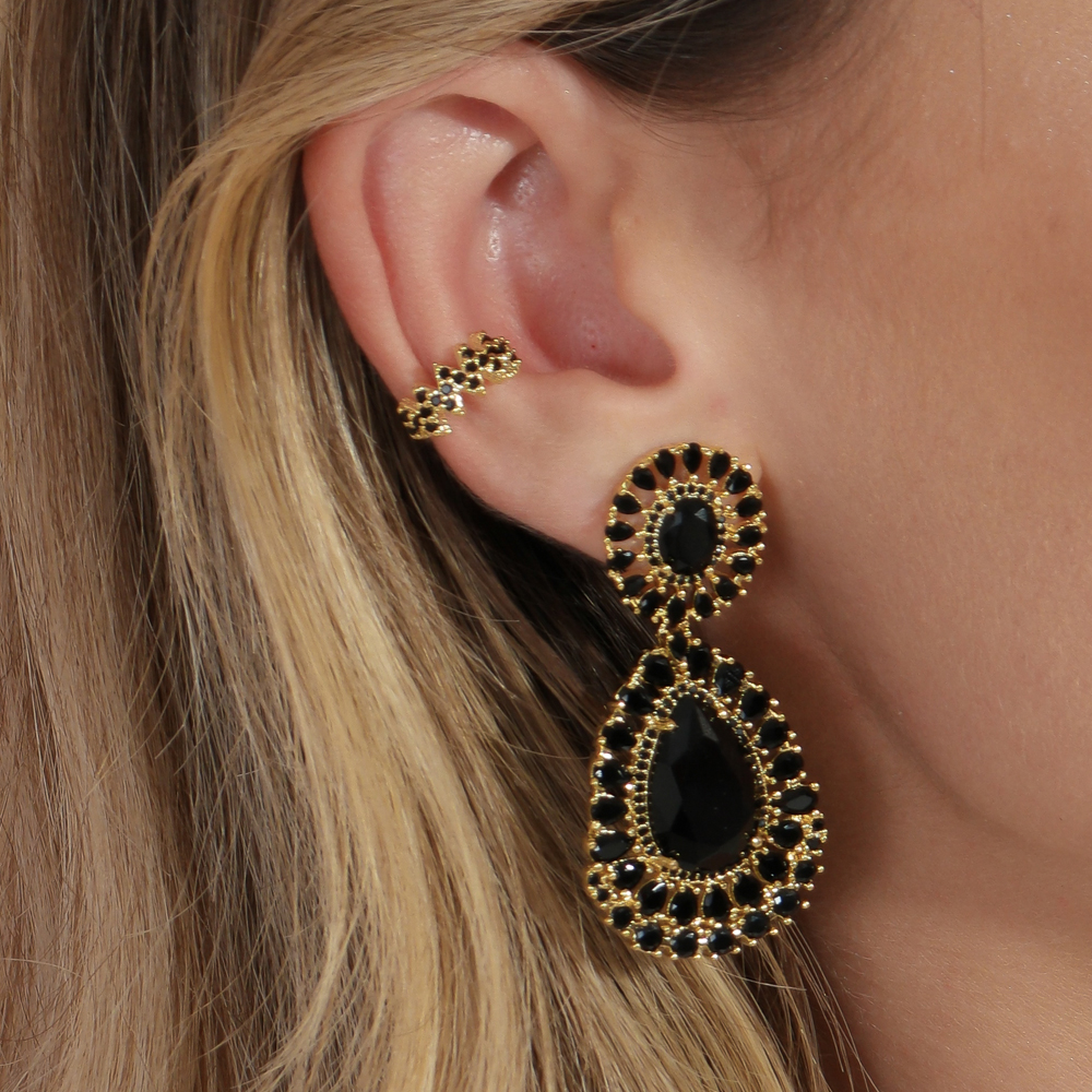Brinco pedra 1mm zircônia preta, 2,5mm redonda 3,5x3mm gota, 8,5x6mm oval, 18x11mm gota, medindo 5x2,5cm BANHO DE OURO