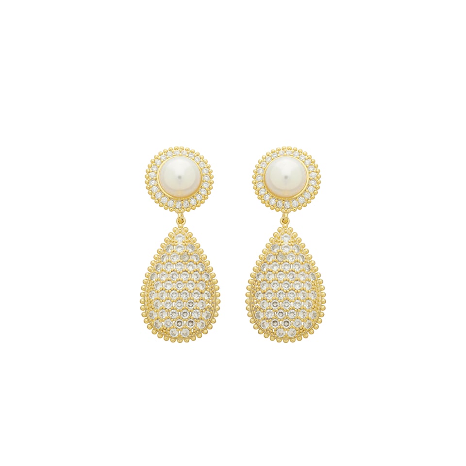 Brinco meia pérola 10mm com pedras 1,75mm em volta, gota cravejada de pedras 2,25mm zircônia, medindo 5,1x2,0cm BANHO DE OURO