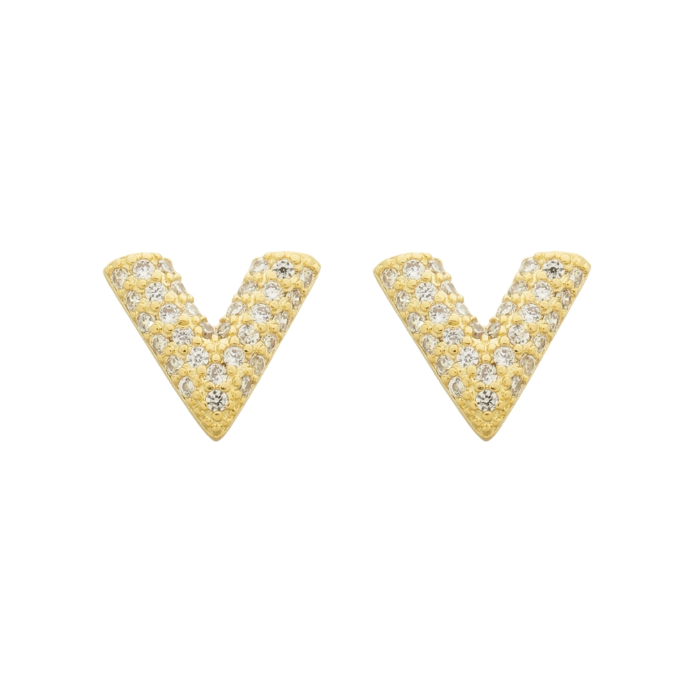 Brinco fixo V cravejado de pedra 1,0mm zircônia, medindo 0,9x1,0cm BANHO DE OURO