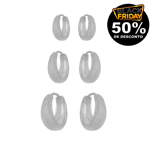 Brinco trio argola click trabalhado, medindo 1,0cm, 1,3cm, 1,5cm de diâmetro BANHO DE RÓDIO