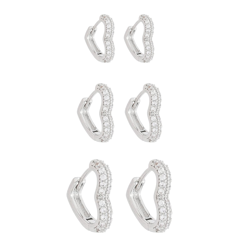 Brinco trio argola click com 2 fileiras pedra zircônia em formato coração, medindo 1cm, 1,5cm, 1,8cm BANHO DE RÓDIO