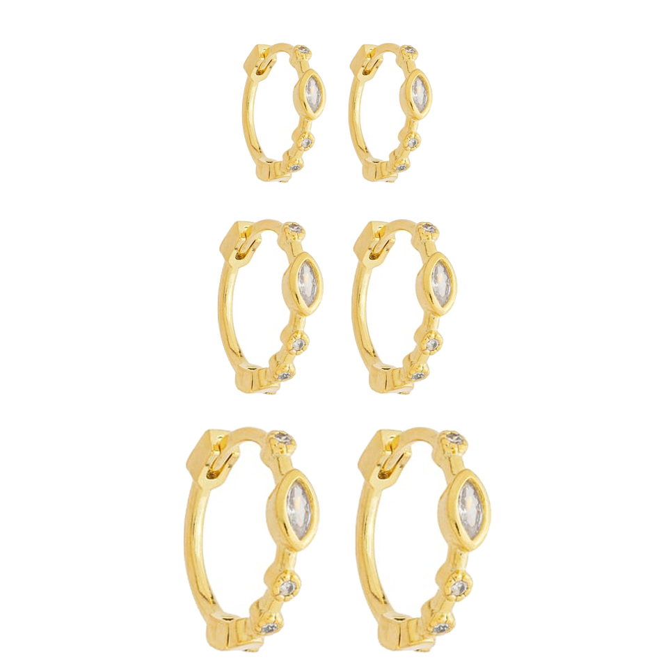 Brinco trio argola click com pedra navete zircônia, medindo 1,0cm, 1,2cm e 1,5cm de diâmetro BANHO DE OURO