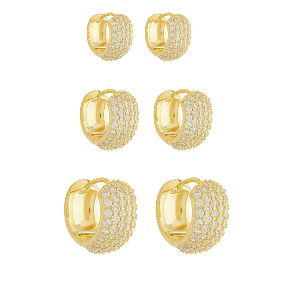 Brinco trio argola click 5 fileiras pedras 1mm zircônias, medindo 1,2cm, 1,4cm, 1,6cm de diâmetro BANHO DE OURO