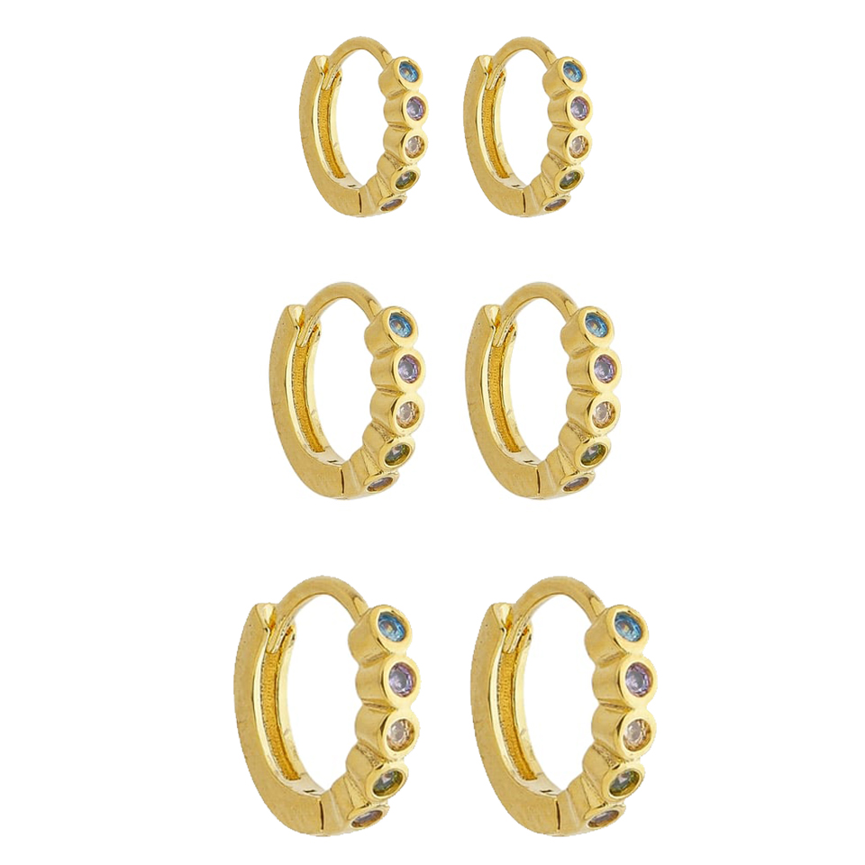 Brinco trio argola click com de pedras 1,5mm zircônia colorida, medindo 1,0cm, 1,2cm e 1,3cm de diâmetro BANHO DE OURO