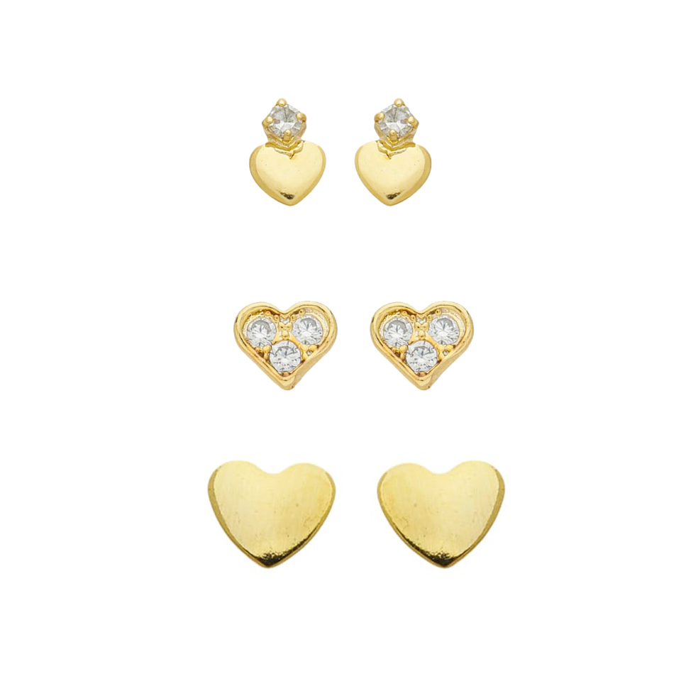 Brinco trio coração: - brinco coração chapa lisa medindo 4x5mm - brinco coração pedras 1,25mm zircônia, medindo 4x5mm - brinco coração chapa lisa com pedra 1,0mm zircônia, medindo 5x3mm BANHO DE OURO