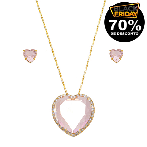 Conjunto brinco pedra 10x10mm coração rosa e corrente veneziana 1,5mm com pingente 30x30mm coração rosa e em volta pedras 2mm zircônia medindo 3,5x3,5cm, comprimento 45+5cm de extensor BANHO DE OURO