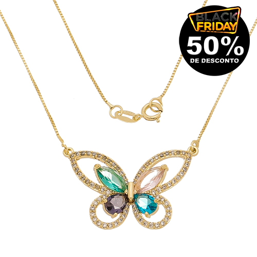 Corrente malha veneziana 0,9mm com borboleta pedras 1mm zircônia, pedras gota 6x5mm zircônia colorida, pedras navete 8x5mm zircônia colodida, comprimento 45cm BANHO DE OURO
