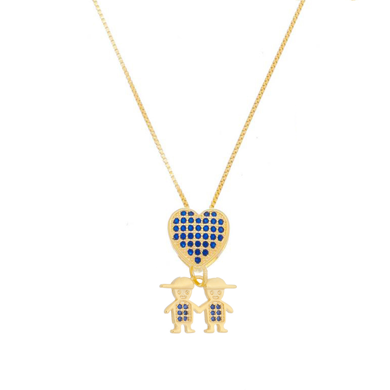 Corrente malha veneziana 0,9mm, pingente coração pedras 1,25mm, com dois meninos pedras 1,0mm zircônia azul, medindo 1,1x1,5cm, comprimento 40 + 5,5cm de extensor BANHO DE OURO