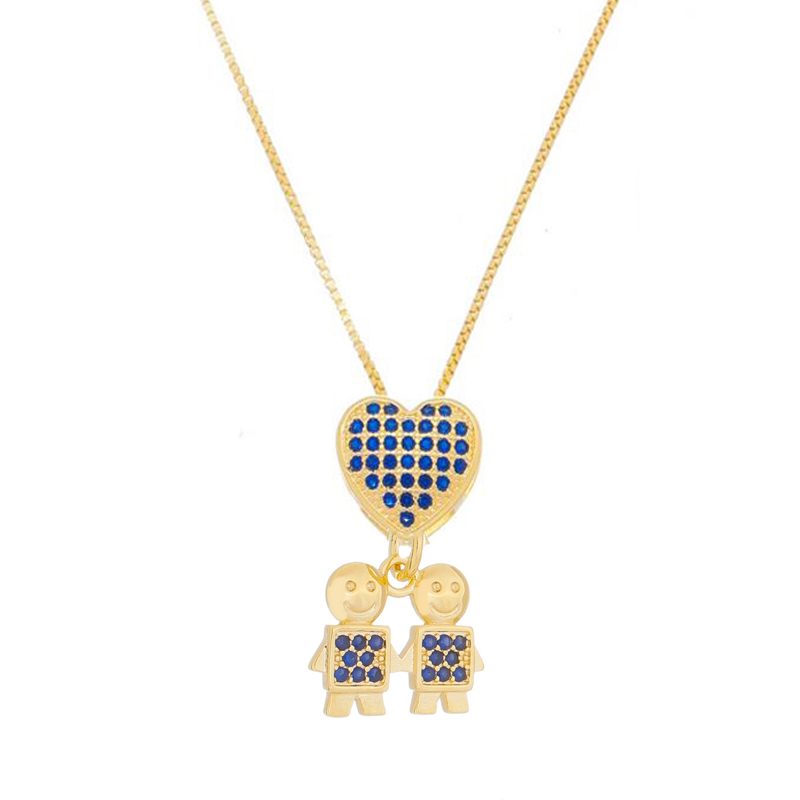 Corrente malha veneziana 0,9mm, pingente coração pedras 1,25mm, com dois meninos pedras 1,25mm zircônia azul, medindo 1,1x1,4cm, comprimento 40 + 5,5cm de extensor BANHO DE OURO
