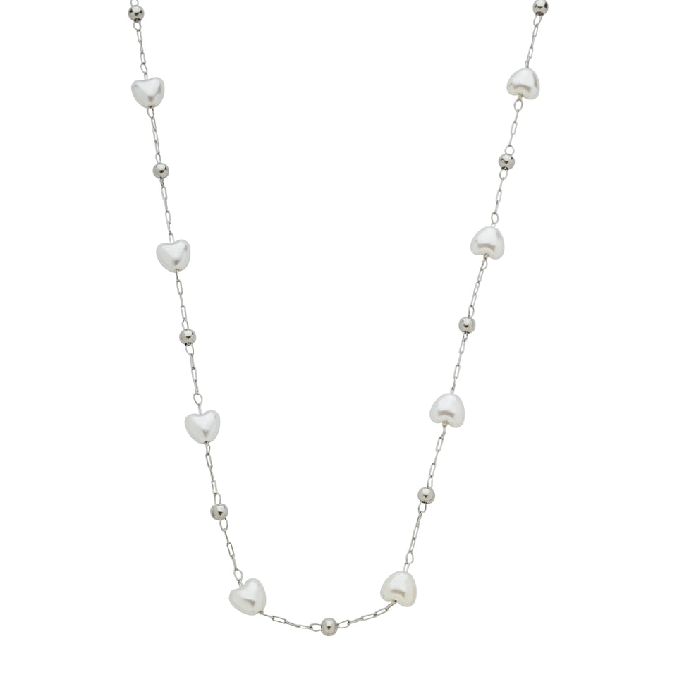 Corrente malha cartier 0,85mm com pérolas 5x6mm coração e bola 3,0mm lisa, comprimento 45cm + 5cm de extensor BANHO DE RÓDIO