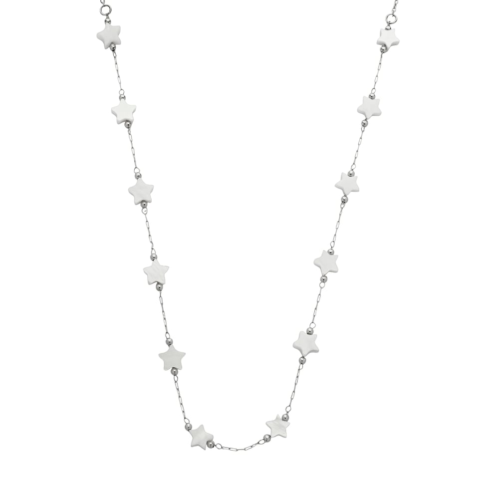 Corrente malha cadeado 1,2mm, malha cartier 0,85mm com estrelas 6x6mm madrepérola e bola 1,8mm lisa, comprimento 37cm + 5cm de extensor BANHO DE RÓDIO