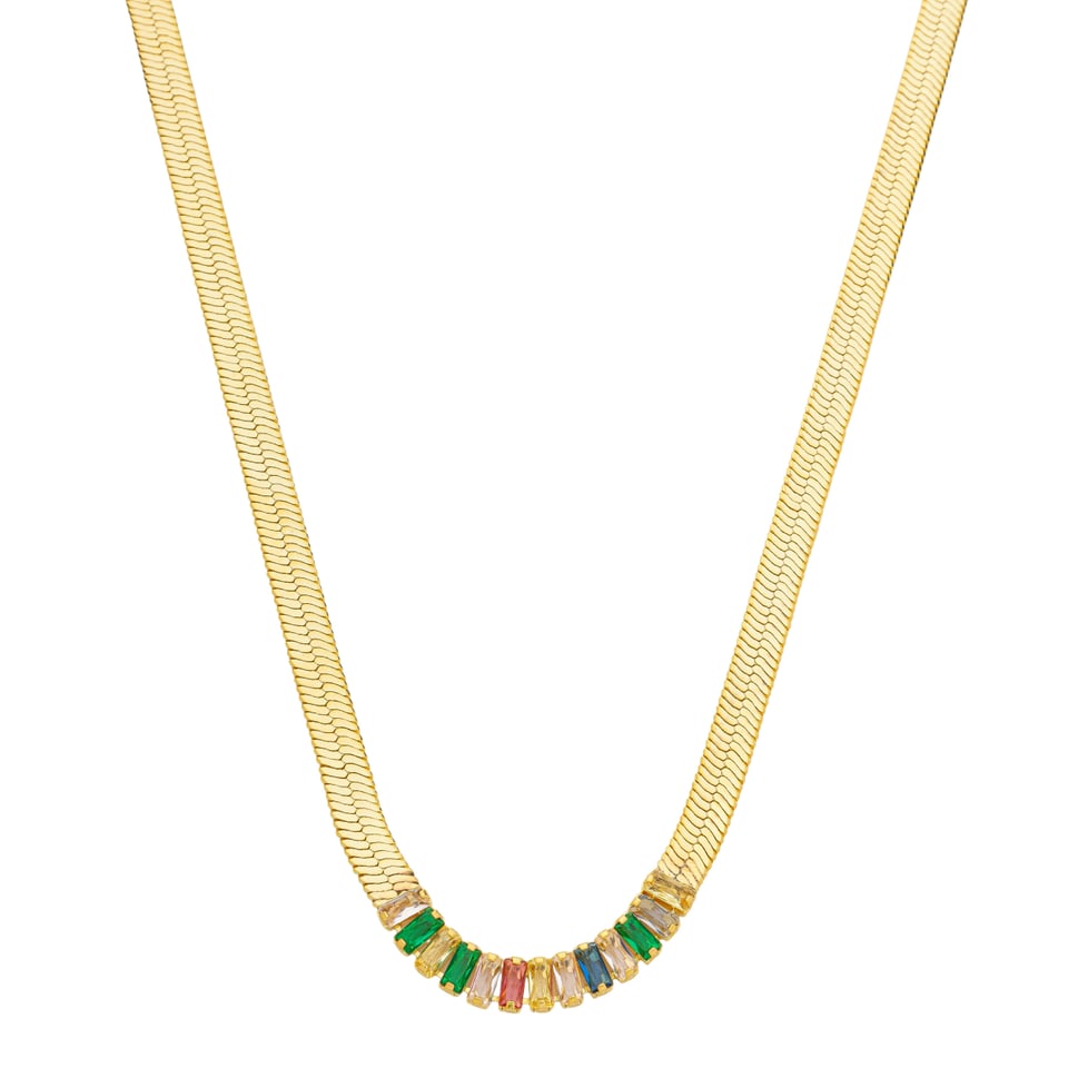 Corrente malha fita laminada 5,3mm com pedra baguete 5x2mm zircônia, comprimento 47cm + 5cm de extensor BANHO DE OURO