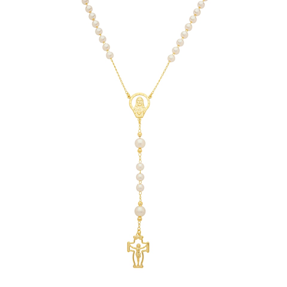 Corrente terço malha elos iguais 1,3mm, pérolas 8mm, 6mm com medalha Sagrado Coração de Jesus, e cruz vazada com Cristo, comprimento 60cm + 8cm BANHO DE OURO
