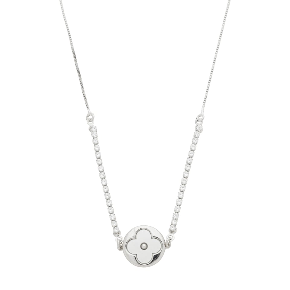 Corrente malha veneziana 0,90mm com pedras 2,0mm zircônia, trevo resinado madrepérola, comprimento 40cm+5,5cm de extensor BANHO DE RÓDIO