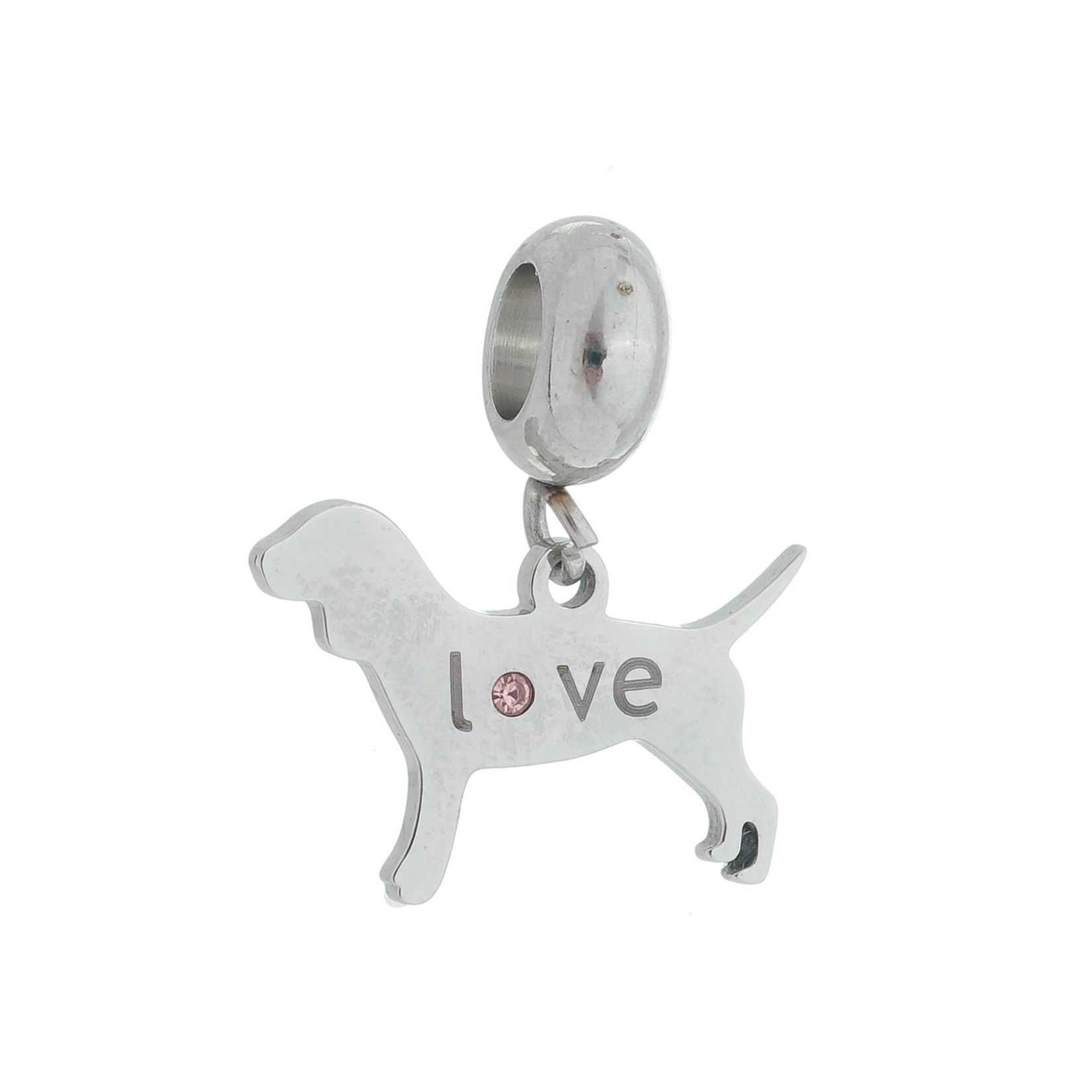 Pingente berloque para pulseira pandora cachorro, escrito Love pedra zircônia rosa medindo 2,0x1,7cm AÇO INOX