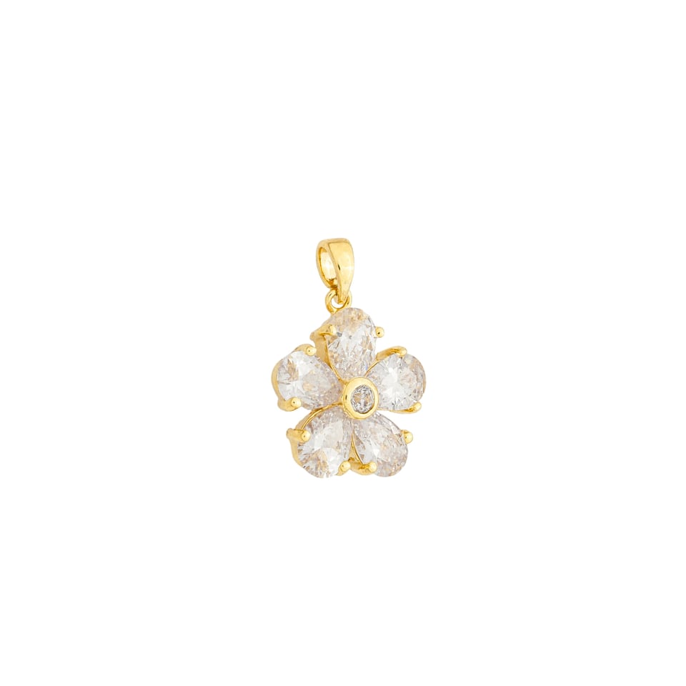 Pingente flor com pedras zircônia, medindo 1,5cm e contra argola 5x4mm BANHO DE OURO