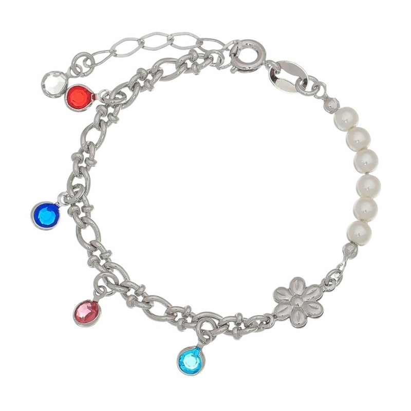 Pulseira malha 1x1 3,80mm com pingentes pedras 3,5mm coloridas, flor em chapa e pérolas 4mm, comprimento 16cm + 3,5cm de extensor BANHO DE RÓDIO
