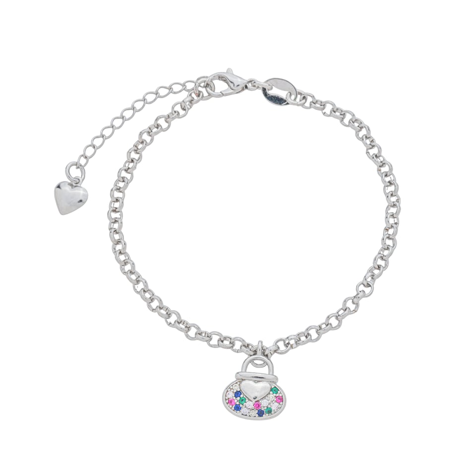 Pulseira portuguesa 3mm com pingente bolsa cravejado com pedra zircônia colorida, comprimento de 16cm + 3cm de extensor BANHO DE RÓDIO