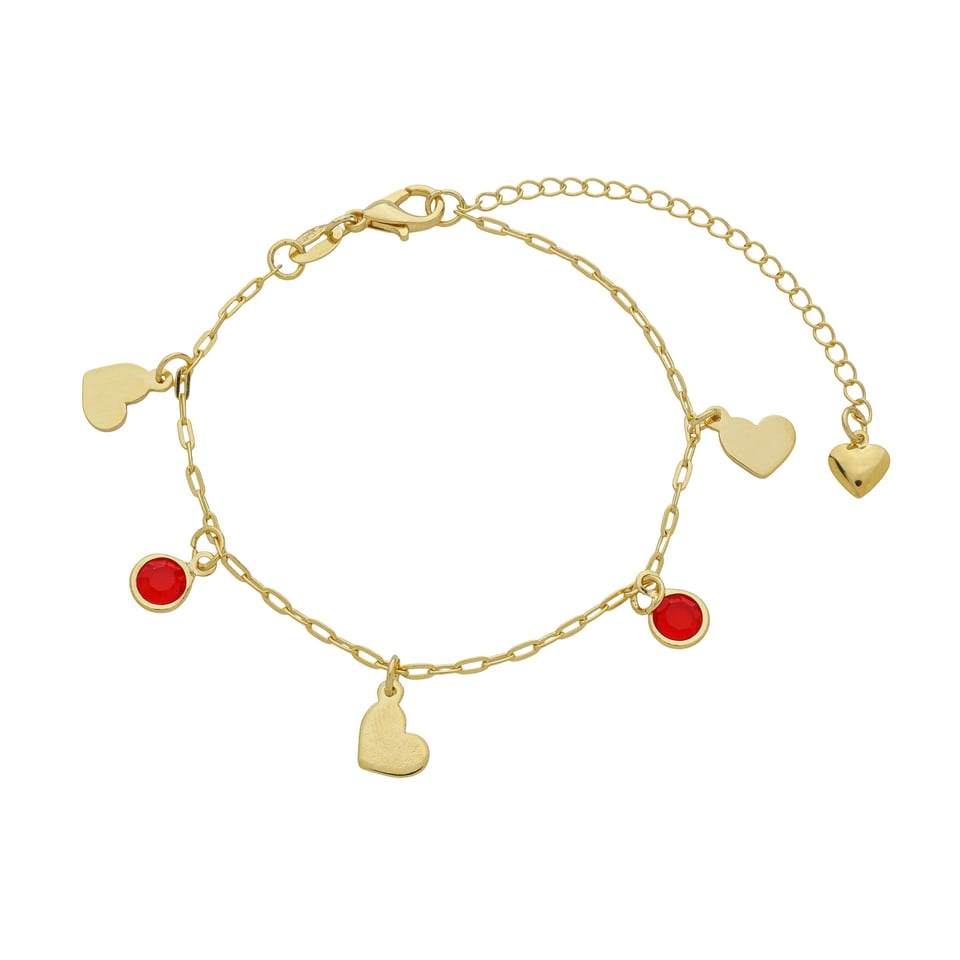 Pulseira malha cartier 1,8mm com pedras 6,7mm vermelha e pingentes coração liso, comprimento 17 + 6,0cm de extensor BANHO DE OURO