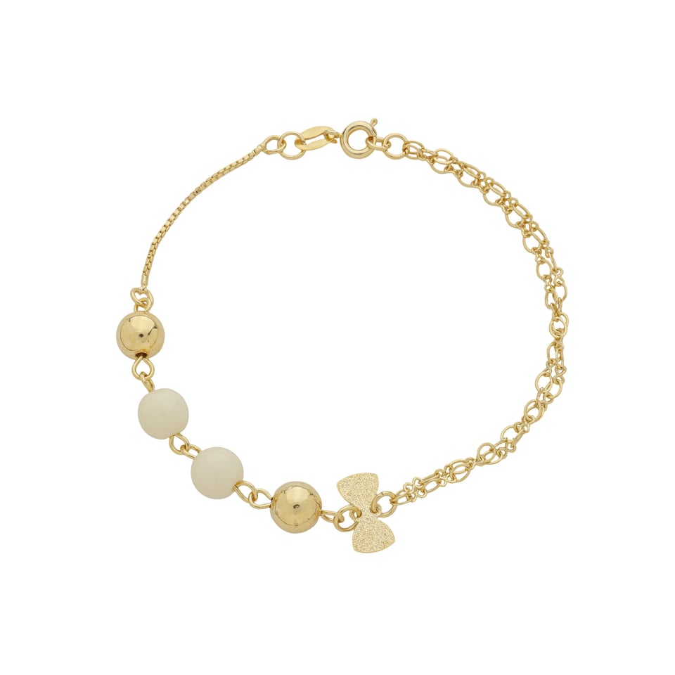 Pulseira malha veneziana 1,0mm e malha 1x1 3,0mm com bolas 7,0mm lisas e pedras 7,0mm com laço diamantado medindo 20cm podendo ajustar para menos BANHO DE OURO