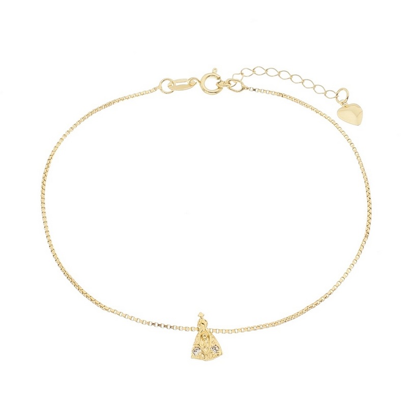 Tornozeleira malha veneziana 0,9mm com pingente Nossa Senhora Aparecida com pedras 1,5mm strass, medindo 1,0x0,7cm comprimento 25cm + 3,5cm de extensor BANHO DE OURO